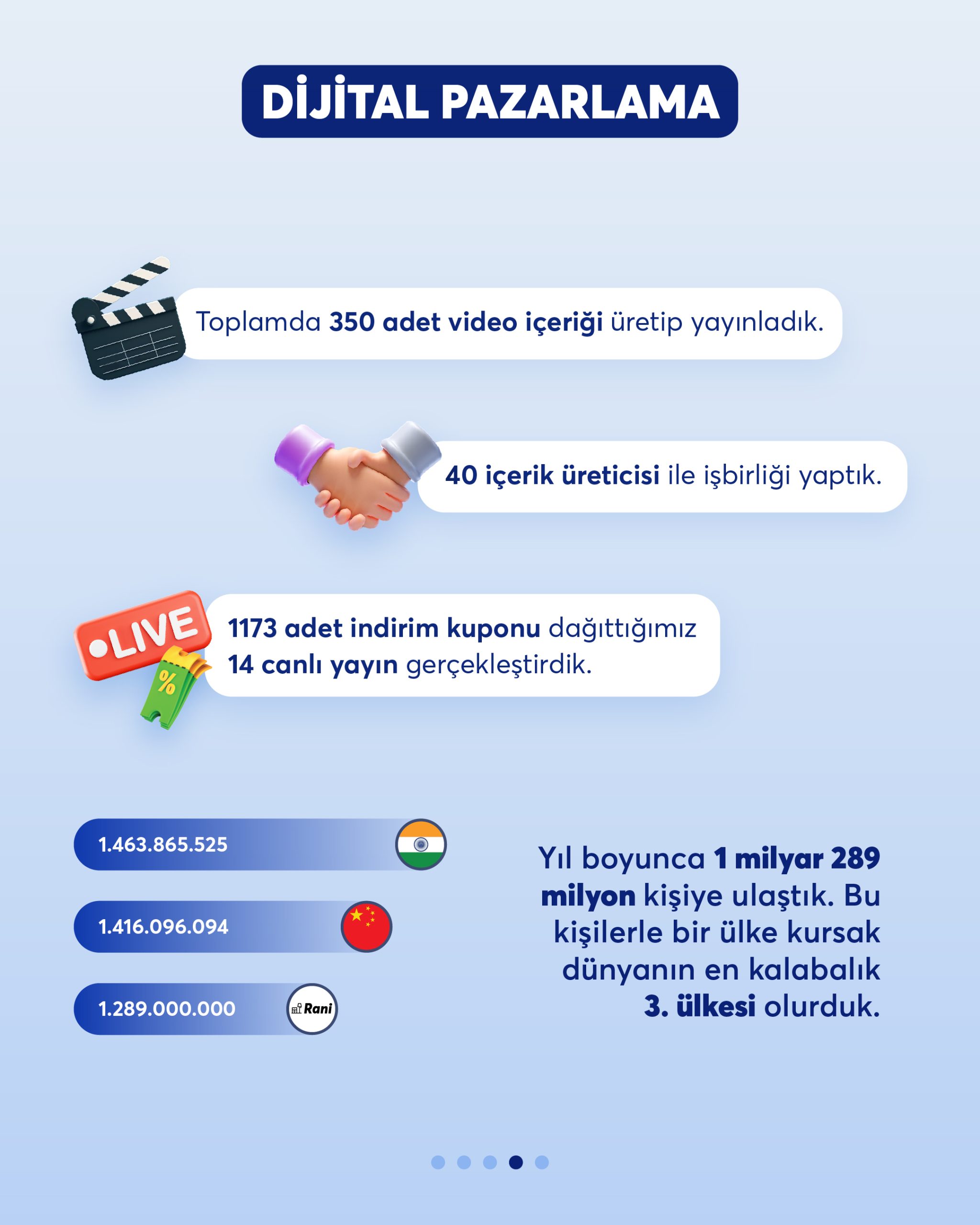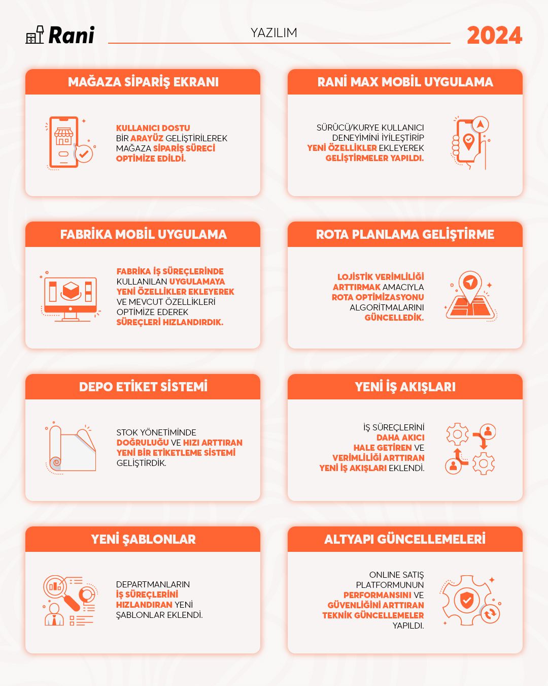 Yıllar içinde attığımız adımları, geliştirdiğimiz hizmetleri ve birlikte yarattığımız etkiyi bu infografiklerde bir araya getirdik. Rani olarak büyüme yolculuğumuzda her yılın öne çıkan başlıklarını burada görebilirsiniz.